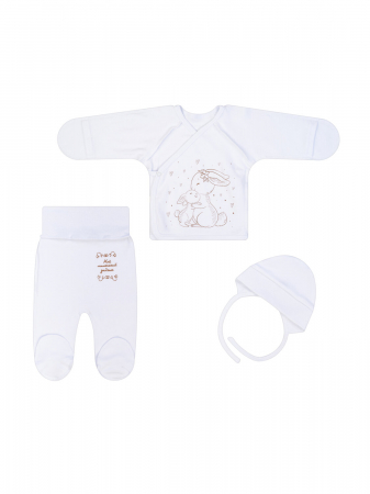 Детский ясельный комплект для новорожденных из нежного трикотажа. В комплекте три предмета: кофточка-распашонка на запах, ползунки с закрытой ножкой, чепчик. Распашонка застегивается на запах на две кнопочки у горловины и сбоку на талии, спереди принт золотистого цвета мама зайка и малыш зайчонок. На рукавах клапан для закрытия ручек. Ползунки на широкой мягкой резинке. Сбоку надпись "Мой маленький зайчик"