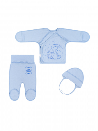Комплект для новорожденных из нежного трикотажа (хлопок). Состоит из трех предметов: распашонки, ползунков и чепчика. Распашонка на запАх с удобной застежкой на кнопку сбоку, спереди лаконичный милый рисунок. Рукава длинные со специальным клапаном для закрытия маленьких ручек. Края обработаны трикотажной бейкой. Короткие ползунки с закрытыми ножками на широком эластичном поясе (еврорезинка), небольшой текстовый принт сверху. Чепчик с завязочками край обрамлен эластичными трикотажем. Комплект сшит из однотонного трикотажа швами наружу.