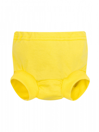 Детские повседневные трусы из нежного хлопкового трикотажа желтого (лимонного) цвета. В пояс вставлена резиночка, которую можно отрегулировать через отверстие сбоку. В ножках мягкие манжеты.