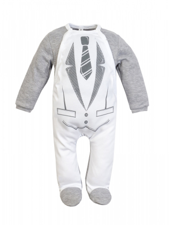 Практичный комбинезон с закрытыми ножками серого меланжевого и белого цвета с принтом имитацией классического костюма с галстуком. Горловина и края обработаны мягкой трикотажной бейкой. Застёжки-клёпки расположены спереди по диагонали. Гипоаллергенный, нежный на ощупь, дышащий, хорошо тянущийся в ширину трикотаж. Не требует сложного ухода, идеально переносит частые стирки.