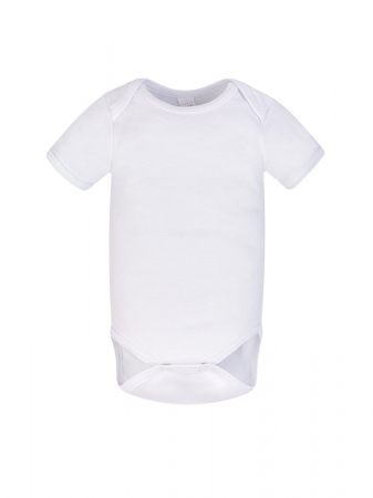 Гипоаллергенный, дышащий, гладкий и мягкий на ощупь трикотаж. Боди белого цвета с коротким рукавом. ЗапАх на плечиках, застёжки-кнопки между ножек.