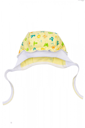 Ясельный чепчик из набивного интерлока (с рисунком). Для комфорта новорожденных сшит швами наружу. Специально для малышей перед чепчика обработан мягкой эластичной манжетой. По нижнему краю трикотажная бейка, переходящая в тесемочки.