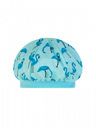 Качественный детский берет обязательно станет любимым головным убором малыша. Изделие аккуратно выполнено из кулирки. По краю берета проходит эластичная трикотажная манжета, благодаря которой изделие не сползает на глазки и не поднимается вверх, открывая ушки ребёнка. Сшито из трикотажа нежного голубого цвета с принтом фламинго.