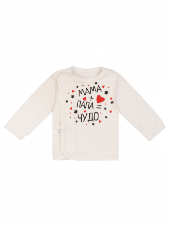 Ясельная трикотажная кофточка-распашонка с длинными рукавами из нежного, тонкого, приятного к телу материала молочного цвета. Сшита швами наружу. Застёгивается спереди на клёпки. На рукавах клапаны для открытого/закрытого положения рук. Край обработан трикотажной бейкой. Спереди надпись «Мама+Папа=Чудо».
