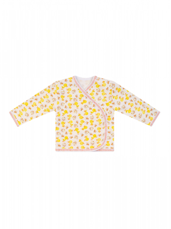Кофточка-распашонка ясельная из бежевого футера с принтом утенок. Ручки открытые. Застёжка спереди на кнопку, край обработан трикотажной бейкой. Сшита из мягкого теплого, плотного трикотажа. Подходит для частой стирки и носки.