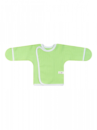 Мягкий, гладкий на ощупь, эластичный трикотаж салатового цвета. Особенности модели: кофточка-распашонка. Сшита швами наружу. По краю обработана трикотажной бейкой. Кнопка-застёжка спереди. На рукавах клапаны для открытого или закрытого положения рук.