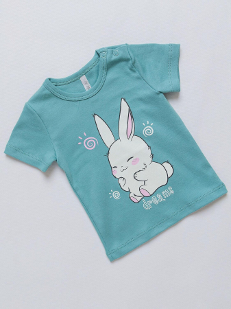 Футболка с коротким рукавом для девочки с кнопками на воротнике. Футболка batik для новорожденных и малышей выполнена из мягкого хлопкового трикотажа, который прост в уходе, дарит ощущение комфорта и позволяет телу дышать. Свободный прямой крой не сковывает движения и позволяет ребенку быть активным. Нежная мятная расцветка и принт в виде кролика.