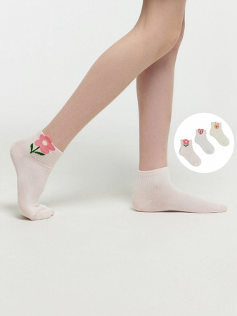 рис.2771 Мультипак из трех пар гладких детских носков с резинкой средней высоты и объёмными рисунками в виде цветка, сердца и зайца.