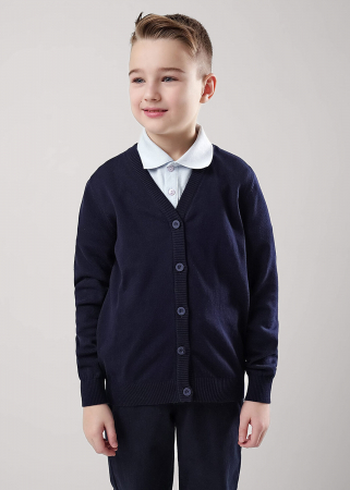 Базовый кардиган из хлопковой пряжи для мальчика. Застежка на пуговицы, по низу рукавов и изделия эластичная вязка.