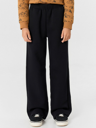 Брюки для мальчиков, прямого силуэта. Пояс цельнокройный с втачной эластичной тесьсьмой. Пояс прострочен двумя отделочными строчками. По переду обработаны карманы в швах. Низ брюк обработан швом в подгибку на двухигольной плоскошовной машине.