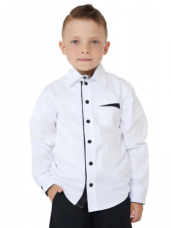 Белая приталенная рубашка для мальчика с длинным рукавом, нагрудным карманом и контрастной отделкой. Удобная застежка на кнопках позволяет ребенку легко одеваться самостоятельно. Стильный и аккуратный фасон подойдет для школы, праздников и повседневной носки.