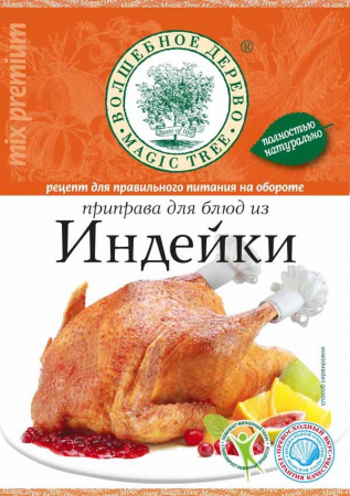 Приправа содержит набор пряностей и сушеных трав в оригинальном сочетании для приготовления блюд из индейки.