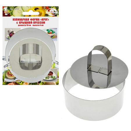 Кулинарный формы-удобный и незаменимый инструмент в арсенале каждой хозяйки для подготовки праздничного стола. Эти специальные полые формы используются для оформления блюд, помогут сервировать закуски и десерты, пригодятся для порционного тушения, сборки бутербродов и канапе, а также с их помощью можно вырезать идеально ровные фигуры из теста и даже пожарить аккуратный омлет или глазунью. Применение формы при сервировке позволит удивить гостей эффектными шедеврами кулинарного искусства-вы сможете красиво подать на стол практически любые салаты, закуски и блюда, которым необходимо придать идеальную строгость форм. В набор входит форма даметром 10 см и высотой 4 см, которая комплектуется крышкой-прессом. Крышка пресс свободно входит в форму, применяется при выталкивании формованного порционного блюда на сервировочные тарелки. Изготовлено из коррозионностойкой (нержавеющей) стали. После применения рекомендуется промыть губкой с использованием жидких моющих средств. Хранить в сухом помещении.
