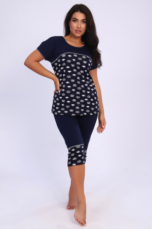 Кофта свободного покроя со спущенной проймой, бейка по горловине и пройме обработана мережкой, бриджи комбинированные снизу