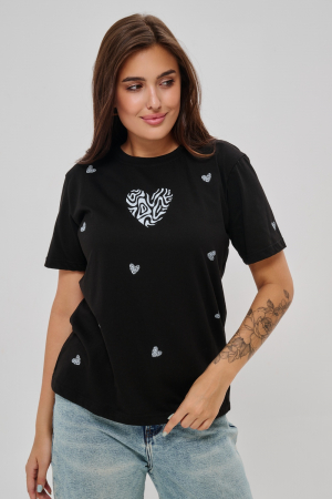 Женская футболка элегантного приталенного кроя с короткими рукавами и классическим круглым вырезом горловины. Минималистичный дизайн дополнен нежными маленькими принтами в форме сердец с узором зебры, создающими тонкий акцент на образ. Материал приятен к телу, обеспечивает комфорт и свободу движений. Идеально подойдет для повседневного стиля, подчеркивая женственность и утонченность облика обладательницы.