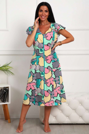 Легкий женский халатик из натурального трикотажа. Приталенный с поясом в боковых швах. Удобные накладные карманы. Расклешённый к низу. Длина миди. Игривый рукав крылышко. Горловина V-образной формы. Для более комфортной посадки на фигуре, на полочках и спинке рельефные швы. Застежка на тесьму молнию.