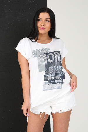 Модель свободного силуэта длиной до линии бёдер, со спущенной проймой. На передней части изделия нанесена стильная современная печать, боковой шов переходит в небольшой разрез, низ спереди чуть короче, чем спинка. Футболка изготовлена из приятной и комфортной вискозы, сочетается с любой одеждой.