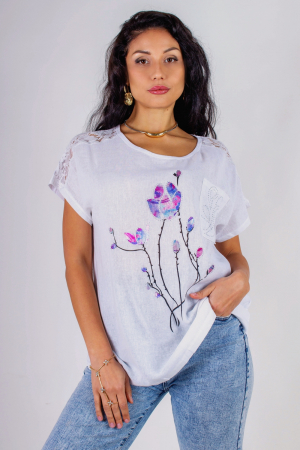 На груди располагается кармашек, украшенный серебристым орнаментом. Он не только добавляет акцент, но и выполняет функциональную роль, позволяя всегда иметь под рукой мелкие вещи. Кроме того, блуза дополнена изящной кружевной полоской, которая визуально удлиняет линию рук и придает образу легкости и романтичности.
