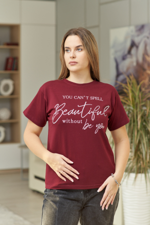 Футболка женская с коротким рукавом, длиной до середины бедра. Вырез горловины округлый, полочка футболки украшена буквенным принтом.