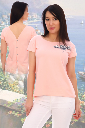 Футболка молодёжная с мерцающим принтом на груди, из эластичного, высококачественного, приятного к телу трикотажа. Горловина круглая, короткий рукав, слегка расклешенная к низу. Имитация распашной спинки украшена декоративными пуговицами, что придаёт футболке некую изюминку. Модель интересная, универсальная, её можно носить с брюками или джинсами, а также с юбкой. Подойдёт как для работы в офисе, так и для повседневного гардероба.