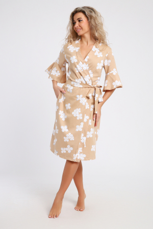 Халат полуприлегающего силуэта на запах с поясом. Рукава с воланами. Карманы в боковых швах.