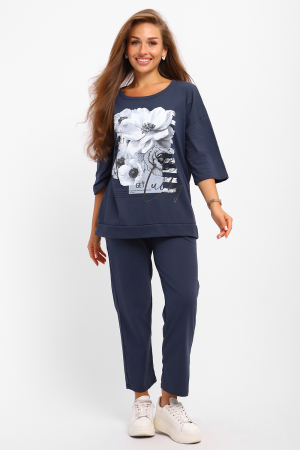Костюм футболка + брюки 7/8. На полочке красивый крупный принт в виде цветов шиповника.