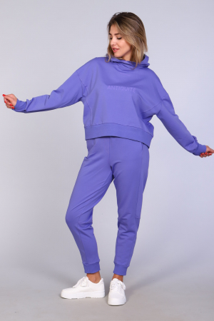 Костюм женский с зауженными брюками с манжетами внизу, на резинке и свободной кофтой с капюшоном и манжетами на рукавах. Модель выполнена из футера 2-х нитки (петля - хлопок).