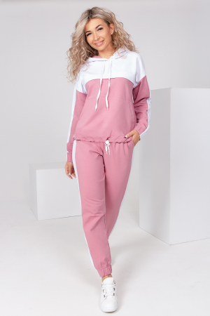 Костюм женский спортивный, состоит из худи и брюк. Толстовка свободного кроя с кокетками спереди и на спинке. На толстовке карман-кенгуру, плечо спущенное, рукава длинные, на рукавах лампасы. Низ рукава на резинке. Низ толстовки с кулисой и шнурком. Капюшон двойной с кулисой и шнурком. Внешний капюшон, кокетки и лампасы выполнены в контрастном цвете. На кокетке толстовки нанесен оригинальный принт - логотип. Брюки джоггеры свободной формы, укороченные. Пояс и низ на резинке. Боковые внутренние карманы. Боковые лампасы брюк в контрастном цвете.