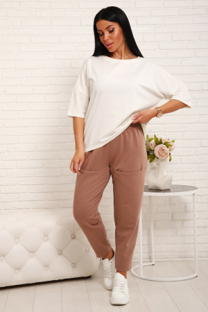 Женский костюм с трендовыми брюками с оригинальными карманами. Футболка свободного кроя со спущенным плечом, рукава короткие, спинка длиннее полочки. Брюки на эластичном поясе, зауженные к низу. Футболка из кулирки премиального качества, брюки из футера - материал легко утюжится, пониженная сминаемость. Стильный силуэт и свежий летний образ.