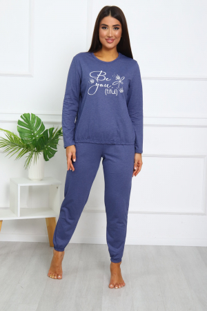 Костюм женский выполнен из меланжированной кулирки. Кофта с длинным рукавом снизу на резинки, горловина окантована, на полочке выполнена печать. Брюки свободного силуэта, по бокам карманы, низ брюк на резинке.