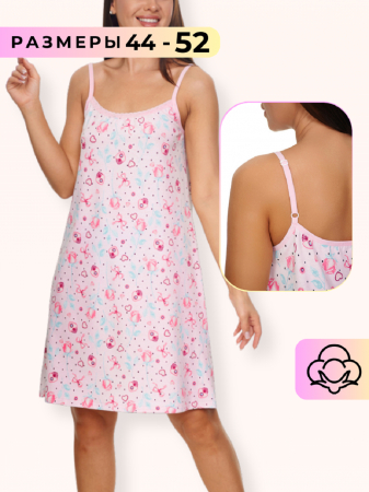 Сорочка женская выполнена из приятного хлопкового трикотажного полотна с милым цветочным рисунком. Сорочка свободного кроя и оптимальной длины. Бретели выполнены из эластичной плоской резинки с регулятором длинны, что добавляет комфорта при носке сорочки, так как позволяет регулировать длинну бретели, не оказывая давления на тело. По полочке выполнено нежное кружево. Сборка по полочке дает дополнительный объем в области груди, не стесняя в движений.