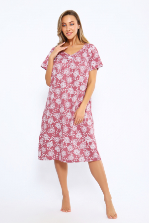 Сорочка свободного кроя с короткими рукавами. Полочка с отрезной кокеткой и сборкой над грудью. Вырез декольте украшен бантиком. Комфортна для повседневной носки и сна.