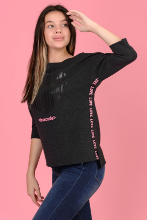 Джемпер с принтом в виде сердца гармонично сочетается с лампасами, расположенными в боковых швах. Горловина в виде лодочки обработана обтачкой, спущенная пройма, рукав 3/4. Низ спинки удлинён, по бокам небольшие разрезы. Джемпер стильный, комфортный подойдёт современной моднице как для активного отдыха, так и для работы в офисе.