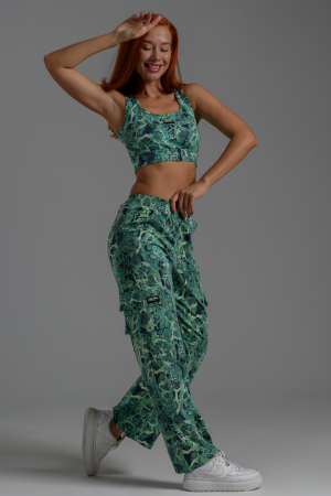 Брюки прямые, на поясе, с боковыми карманами. Декоративные клапаны расположены по бокам брюк.
