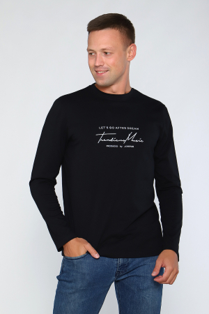 Лонгслив мужской с округлой горловиной, обработанной усилителем. Широкая футболка с длинными рукавами имеет свободный крой и классическую, не спущенную линию плеча.