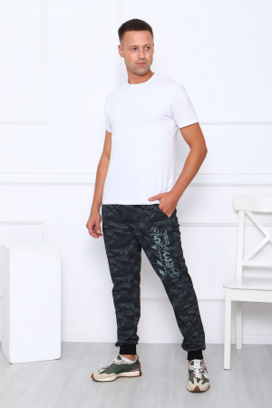Брюки мужские Камуфляж с боковыми карманами и с тематическим принтом на левой штанине, низ на манжетах, комфортный широкий эластичный пояс. Материал устойчив к растягиванию на коленях, износостойкий.