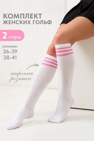 Высокие женские гольфы. Мягкая резинка сверху, по всей поверхности вывязаны полосы, подошва гладкая. В упаковке 2 пары.