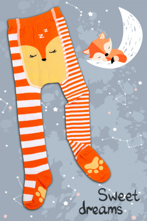 Яркие колготки для малышей. Оригинальная расцветка в полоску - по одной ножке широкая полоса, по другой - узкая. На стопе вывязаны милые лапки, сзади - мордочка спящего лисенка