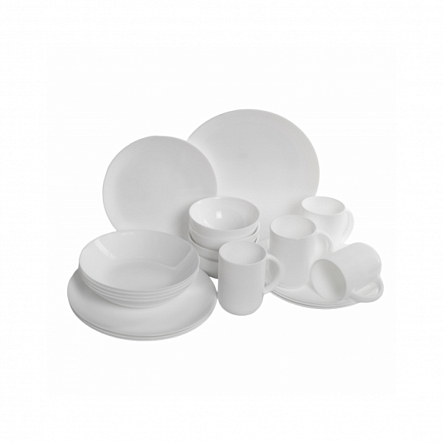 Каждый элемент этого сервиза изготовлен из ударопрочного стекла, что обеспечивает долговечность и надежность в использовании. Такой материал не только устойчив к механическим повреждениям, но и безопасен для здоровья. Белый цвет изделий придает им элегантный и современный вид, легко вписывающийся в любой интерьер.