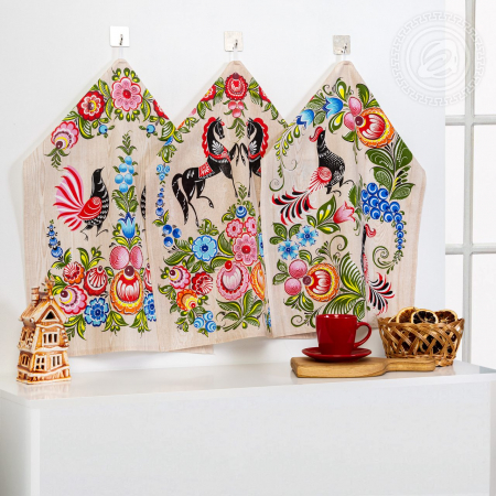 Полотенца из рогожки «Роспись» – это русский сувенир с колоритным орнаментом. На картинке элементы знаменитой городецкой росписи с яркими цветами и сказочными пташками. Они скомпонованы так, что создается ощущение волшебного сада, где цветут роскошные бутоны и поют экзотичные птички.