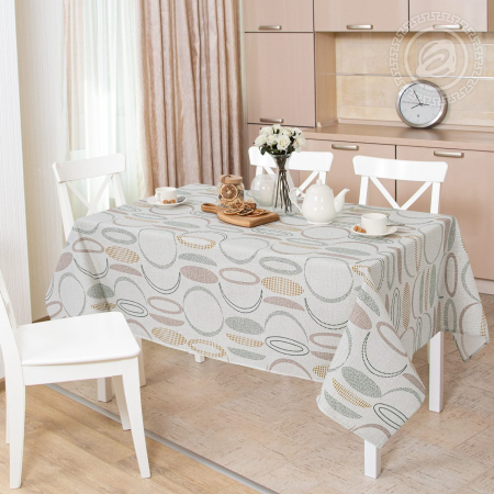 «Тенор» – скатерти из рогожки из 100% хлопка украшены интересным и необычным дизайном в виде геометрии. Композиция включает в себя стильный орнамент с овалами, полукругами, которые выполнены в нежной цветовой гамме. Основной рисунок дополнен нейтральным фоном под лен.