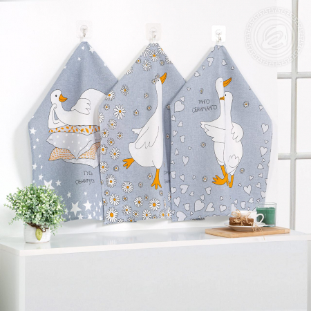 Если вы любите яркие принты и всегда в тренде, то для вас наши кухонные полотенца с гусями. Эти милые птички знают, как поднять настроение. Посмотрите на этих очаровательных гусей. Каждый из них обаятелен и привлекателен. Каждый приковывает взгляд и готов подарить порцию обнимашек! Здесь и гусь на подушках, и гусь с венком из ромашек, и влюбленная пара, танцующая танго-обниманго.