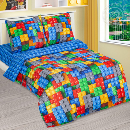 Детское постельное белье 1.5 спальное украшено современным и технологичным дизайном в виде яркого конструктора. Разноцветные детали расположены таким образом, что создается ощущение, будто комплект собран из настоящих элементов любимой игры. Рисунок выглядит оригинально и объемно, словно с эффектом 3d.