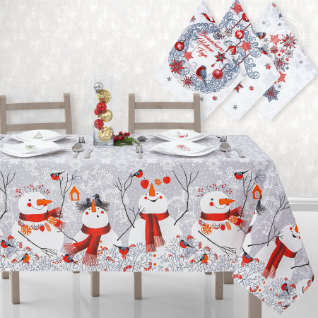 На рогожке милый и забавный рисунок с веселыми снеговиками в красных шарфиках, пушистыми снежинками и снегирями. Дизайн выполнен в нежной цветовой гамме и дополнен причудливыми узорами из веточек рябины и долек апельсина.