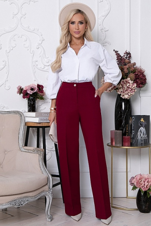 Брюки из плотного хорошо держащего форму жаккардового трикотажного полотна с заутюженными стрелками.Брюки с высокой посадкой по талии застегивающиеся на молнию в гульфике.Пояс притачной с застежкой на пуговицу.Для удобства в носке пояс по спинке собран на резину.По бокам подрезные функциональные карманы.