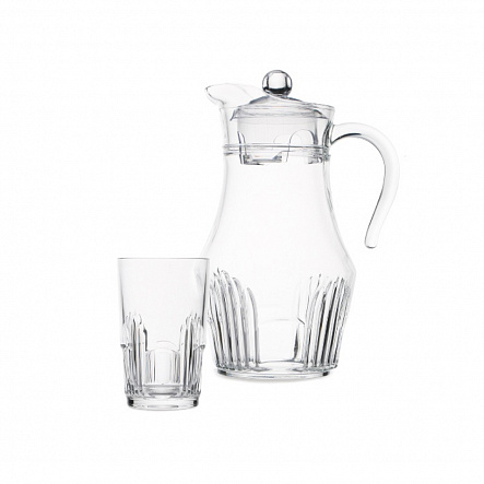 Питьевой набор изготовлен из прозрачного ударопрочного стекла с рельефной текстурой. Закаленное стекло устойчиво к повреждениям, с течением времени на нем не появляются царапины, оно не теряет прозрачности. Все предметы в наборе можно мыть в посудомоечной машине, что облегчает ежедневный уход. Увеличенный объем кувшина рассчитан на 6 стаканов, это удобно для подачи напитков на большую компанию. Питьевой набор украсит праздничный и повседневный стол, избавит его от пакетированных напитков или пластиковых бутылок.