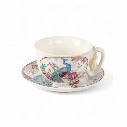 Это прекрасный выбор для любителей чая и эстетически привлекательных вещей. Этот набор состоит из чашки и блюдца, изготовленных из высококачественного фарфора и украшенных изображением красивого павлина, символа богатства и красоты.