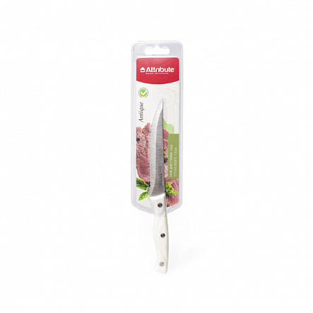 Нож ANTIQUE оснащен лезвием из экологически чистой нержавеющей стали, которая обладает высокими антикоррозийными свойствами. Удобная ручка из прочного пластика зафиксирована дополнительными болтами, поэтому вы можете не волноваться, что лезвие выпадет из ручки. Лезвие ножа очень остро заточено, не затупляется при длительной работе.