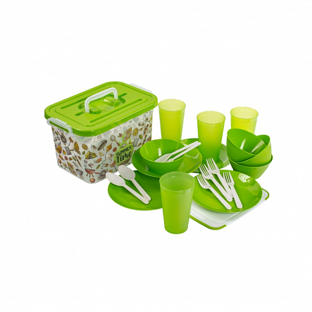 Набор включает в себя все необходимые принадлежности для пикника. Все изделия выполнены из прочного, лекого пластика и прекрасно подойдут для поездки на природу. Изделия из новой коллекции SUMMER TIME имеют яркий дизайн и создаст летнее настроение. Контейнер имеет яркий и привлекательный дизайн, который нанесен по технологии IML, что гарантирует сохранение презентабельного вида контейнера на весь срок ее эксплуатации. Такую посуду просто мыть, как в горячей, так и в холодной воде. Возможно мытье в посудомоечной машине.