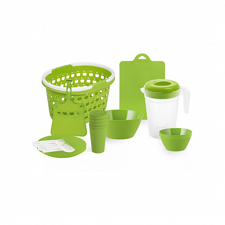 Набор для 4 персон в контейнере 6,5л BBQ party включает в себя: салатники, стаканы 0,4л, ложки, вилки, тарелки, салатник 2,5л, корзинку 10,5л, гибкую разделочную доску, кувшин 2,5 л. Все изделия выполнены из прочного, легкого пластика и прекрасно подойдут для поездки на природу. Изделия из новой коллекции BBQ party имеют яркий сочный цвет и создадут летнее настроение. Такую посуду просто мыть, как в горячей, так и в холодной воде. Возможно мытье в посудомоечной машине.